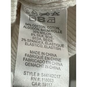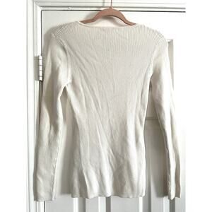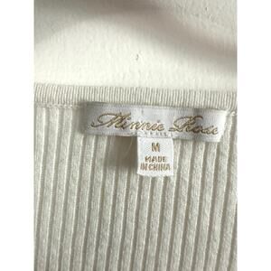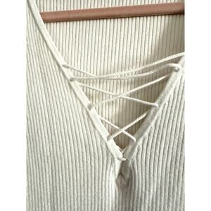 MINNIE ROSE Creamy White Lace-Up V-Neck Cotton-Silk Ribbed Top Shirt - Sz M