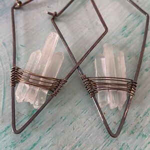 Selling a like-new pair of MINT JEWELRY geode earrings. Geometric shaped sterling silver earrings with wire-wrapped clear quartz crystals makes these a beautiful statement piece to any boho and mountain wardrobe. These are the larger pieces (approximately 2” long). Perfect for adding a touch of sophistication to any outfit. Metal is tarnished; could use cleaning (only due to air exposure and not usage). Comes from a pet and smoke-free home.