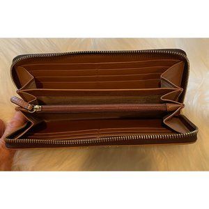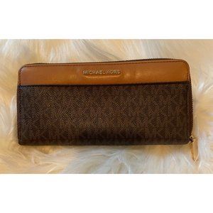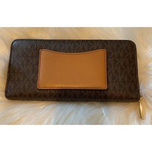 EXCELLENT CONDITION, Michael Kors wallet. Traditional MK initials stamped front and back. Lots of storage, holds up to 12 cards, separate compartment for change and two separate areas for bills. Gold zipper, and exterior ID holder and the rear of the wallet.