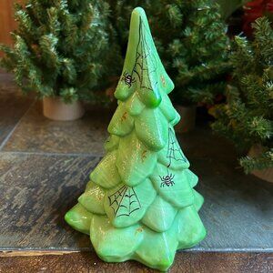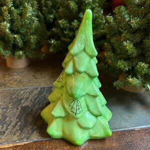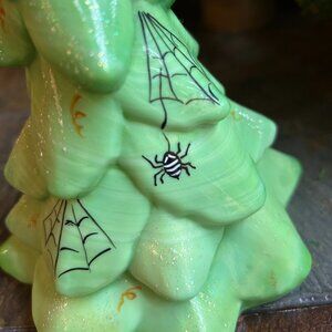 • Heavy molded/poured glass “Christmas” tree hand painted with Halloween motifs