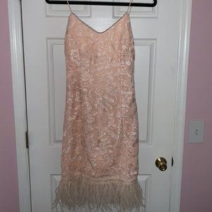 Neutral colored (light pink/peach/ nude) leather-trimmed fitted lace dress with strappy back.