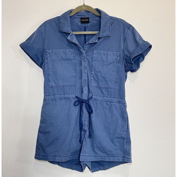 MIOU MUSE Easygoing Romper Size Small Blue 100% Cotton Tie Waist Shorts Casual
