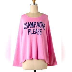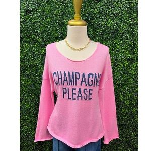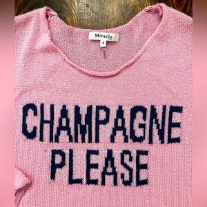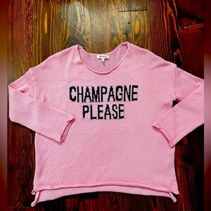 CHAMPAGNE PLEASE!! I love this bubble gum pink lightweight sweater with navy lettering! Slight flare in the sleeves and hem line! Great preowned condition! I believe this to be an oversized fit!