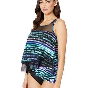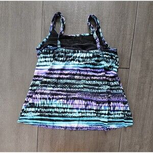 The Miraclesuit Mirage Tankini Swim Top in size 10 is a stylish and supportive swimsuit designed for women. It features a flattering tankini style with underwire support in a sleek black color with striped pattern. Made from a comfortable and stretchy blend of nylon and spandex, this swimsuit is perfect for beach days or lounging by the pool. Its beachy and colorful theme adds a fun and vibrant touch to your poolside style. See pictures for measurements.