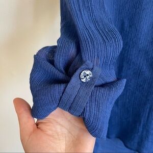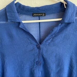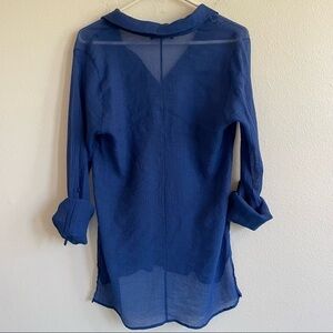 Vibrant blue top from the brand Miraclesuit. Super lightweight and airy, perfect to throw on over a swimsuit or wear as a normal top. Roll tab sleeves so you can adjust the sleeve length. Size S and in great pre-owned condition.