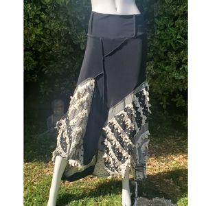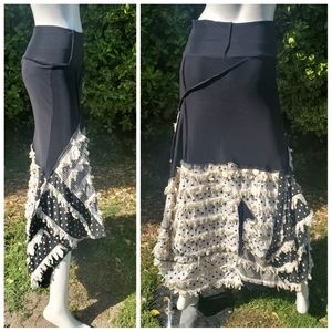 Incredible reconstructed skirt using Paula Sweet Muslin Mink textiles. Fitted stretchy top with polka dot bottom. Like new. Art to wear