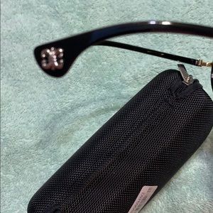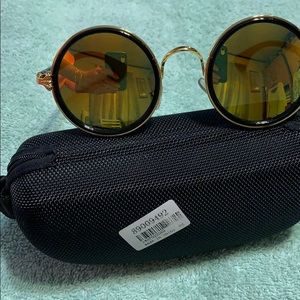 NWT:: NEW IN ZIPPERED CASE, MIRRORED ROUND SUNGLASSES. SMART STYLISH IN ZIPPERED HARD CASE. YELLOW TONED, GOLD AND BLACE RIMS, GOLD HINGED W DETAIL ON EAR PIECE.