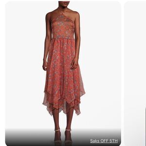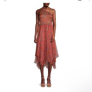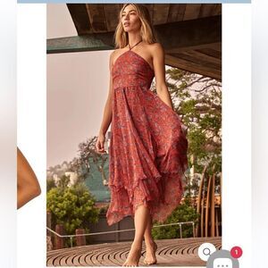 The Adele Dress from Misa is a beautiful midi-length, halter neck dress with a whimsical, breezy skirt. There is a subtle ruffled hemline adding extra feminine details to this dress!