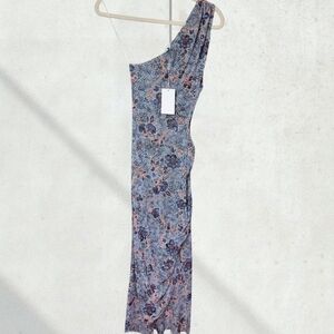 Elegant and distinct in equal measure, this MISA dress features a slightly asymmetrical silhouette with a one-shoulder neckline, a cutout at the side, and a dense abstract pattern.