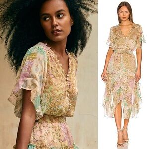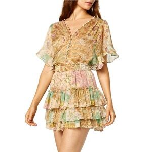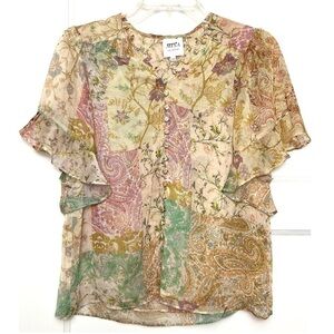 MISA Chiffon Floral Paisley Patchwork Flutter Short Sleeve Button Front Top XS