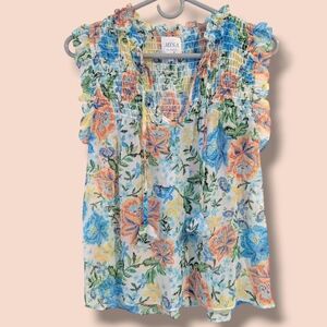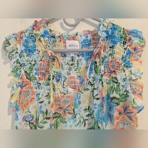 Size SM. Extremely lightweight. Soft and comfortable. Has stretch. Smocked top half. Ruffle trim. Tie front. 100% polyester.
