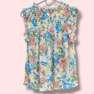 MISA Colorful Floral Sheer Chiffon Ruffle Sleeveless V-Neck Agot Top Tropical