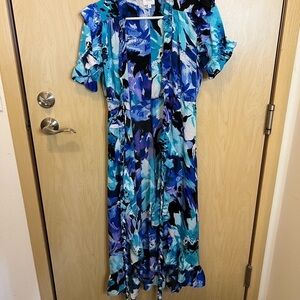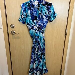 MISA Faizah Floral Watercolor Blue Ruffle Wrap Dress