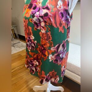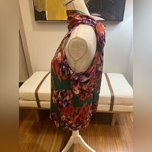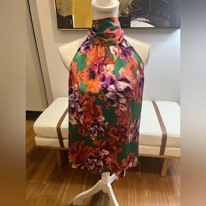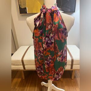 MISA LA women’s beautiful floral tie neck blouse with single button enclosure at top keyhole in the back large tie, neck, sleeveless, gorgeous, floral, teal, and orange print, this is an excellent condition, size small