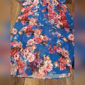 Beautiful Spring cut chiffon floral dress. Faux wrap dress with a v-neck style. Elastic waist with a high to low hem. Perfect dress for any day or any event - Digital Blue Floral - Deep V-neck - Ruffled Trim Cuff Sleeves - Dry Clean - 100% Poly Chiffon - Made in USA