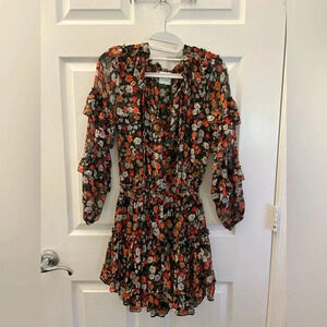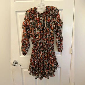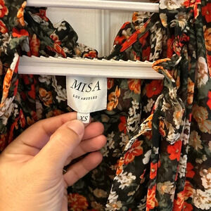 Misa Los Angelos red orange white black floral print dress. This silk dress is perfect for any occasion especially the fall!