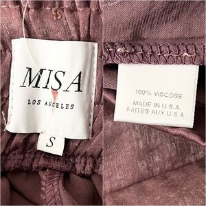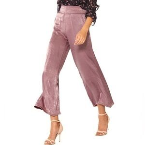 Standout in these stunning Misa Los Angeles pants cut from a gorgeous satin viscose in a dusty rose. A banded front waistband for a clean look is paired with elastic gathering at the back waistband to provide a flattering fit. Side slit pockets lead into flowing wide legs.