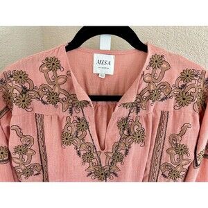 MISA LOS ANGELES Embroidered Floral Boho Tunic Top Blouse Tassel Coral Sz XS NEW