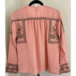 Elevate your style with this MISA LOS ANGELES tunic blouse featuring an embroidered floral design and colorful tassel accent. The V-neck with tie at neck and relaxed sleeve type make it perfect for any casual or party occasion. Made of rayon and viscose woven fabric, this blouse comes in a coral color and is suitable for all seasons. The pull-over closure with tie at neck adds to the bohemian and peasant style, making it a must-have for any designer wardrobe.