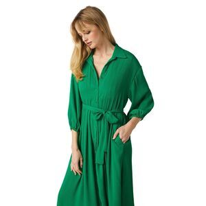 A feminine update to the midi shirt dress, the Elise is cut from a kelly green chiffon fabrication. Featuring a full button front with pleat detail and fold-over collar with adjustable tie waist. 3/4 sleeves taper into a slight balloon elasticated cuff.Made in the USA Dry Clean 100% Poly ChiffonBecause this style can be worn belted or as a shirt dress, we recommend taking one size down if you are between sizes.