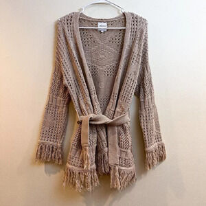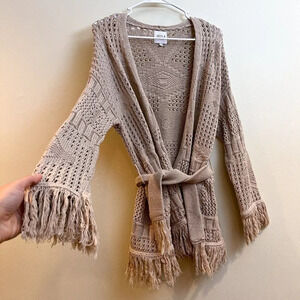 MISA Los Angeles Aztec Fringe Bohemian Tan Tie Waist Knit Cardigan Sweater Small