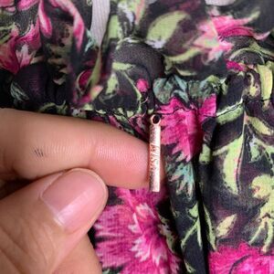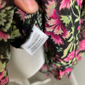 Beautiful floral print mini dress featuring a romantic ruffled neckline, long sleeves, and an elastic waist for a flattering fit. Made from lightweight polyester fabric with a flowy silhouette. Perfect for spring/summer events, garden parties, brunch dates, or special occasions. The black background with vibrant pink flowers creates an eye-catching look. In excellent condition.
