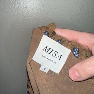 Keywords: MISA Francesca top, MISA Los Angeles off shoulder, boho blouse, tumeric combo print top, Lucy Hale outfit, Revolve MISA top, peasant blouse, festival style, made in USA top, brown boho top, viscose blouse