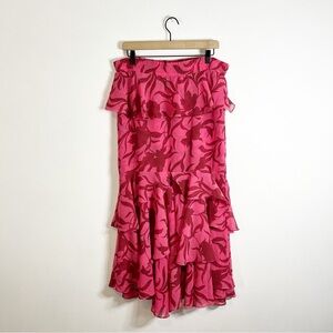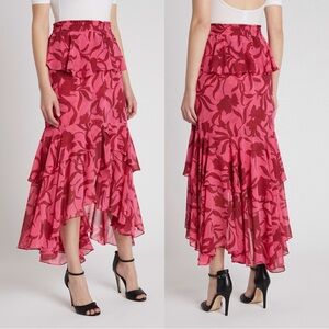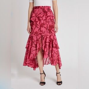 Excellent preowned condition womens size small. Pink and red bold floral midi flowy skirt. Constructed from vibrant floral chiffon, this midi skirt features a playful feminine silhouette with a ruffled waist and asymmetrical high-low hemline.