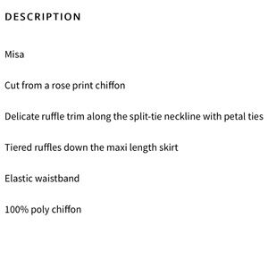 This new with tags Misa La vie en Rose Hollen dress is the perfect trans-seasonal silhouette cut from a rose print chiffon. The top features a delicate ruffle-trim along the split-tie neckline with our signature petal ties while tiered ruffles decorate the maxi skirt. An elastic waistband provides real comfort and a flattering silhouette. A perfect day-to evening dress. Price is firm and non negotiable. No bundles or offers please. Thank you.