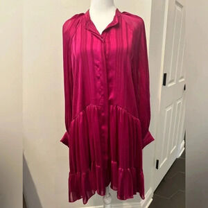 Fuchsia shirt-dress with stripes, a button-down center, and soft ruffles throughout. Features long sleeves, a relaxed fit and oversized style.
