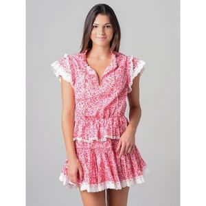 Keywords: MISA Los Angeles dress, Lilian Dress, knee length dress, pink floral dress, women's party dress, cocktail dress, lace dress, short sleeve dress, keyhole neckline, floral print dress, ruffle accents, lace trim, women's fashion, pre-owned dress, dry clean only