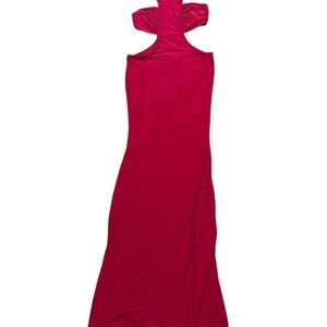 Stunning MISA Los Angeles Lyra dress in bold fuchsia pink, sold on Revolve. Features sleek cutout sides, a high slit, and a chic open back for a modern, elegant look. Perfect for weddings, formal events, or a night out. Originally $390 — now offered at a fraction of retail.