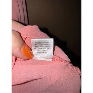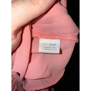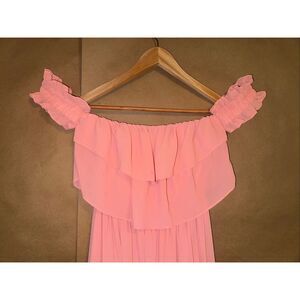 Tiered ruffle crepe chiffon fabric. Off-shoulder styling with ruffle tie straps peachy blush. 100% Viscose.Partially lined to knee. Pull-on styling with smocked waist. Neckline to hem measures approx 40.5" in length. Rosy pink. See sleeves for exact style- arm bands.