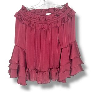 MISA Los Angeles Saskayi Off the Shoulder Long Sleeve Tiered Ruffle Burgundy Blouse Women’s Size S