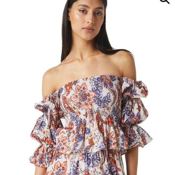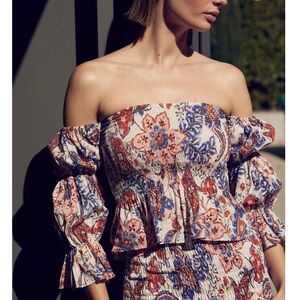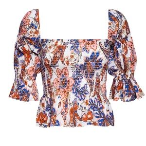 The perfect transitional piece, Vida is a flirty cropped top cut in a harvest floral cotton poplin fabrication with a smocked bodice and peplum ruffle finish. Elbow length elastic puff sleeves feature a ruffle trim and can be worn on or off the shoulder. Style it with everything from denim to our coordinating Phoeby skirt for a feminine set.