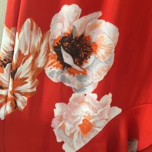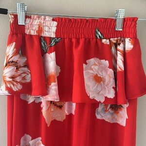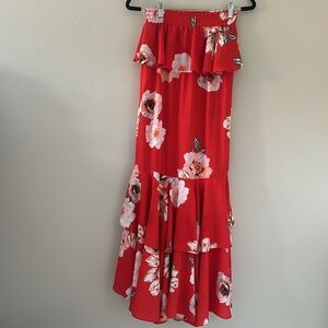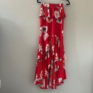 Elegant red maxi skirt with a beautiful floral pattern. Perfect for any occasion.