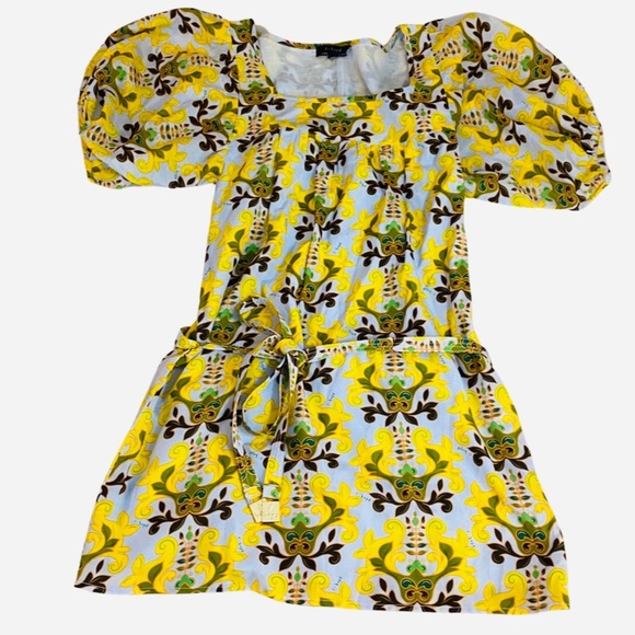 Gorgeous and bright pattern mini dress from TBags for Misa. Trendy puffy sleeves. Wrap tie belt. Excellent condition