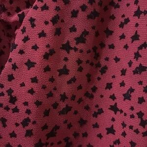 Stylish red blouse with black polka dots. Features ruffle details and long sleeves.