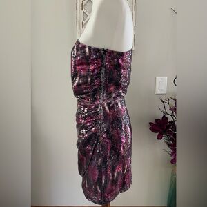 MISA Los Angles Nova One Shoulder Mini Dress In Fuchsia Ikat Sequin Size L