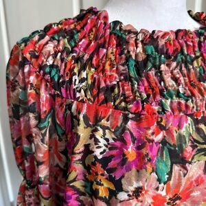 This dress is so coquette girlie! From mid-lux brand MISA Los Angeles, the Marin dress features a multicolored floral print with black base color, shirred neckline, blousy bodice, elastic stretch waistband, mini length skirt with ruffle hem, lined, and long billowy sleeves features shirred cuffs. Excellent condition and a retail price of $378!