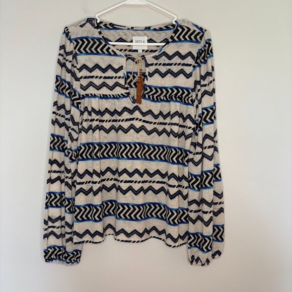 MISA Pullover Top Womens Small Off White Blue Tassel Balloon Sleeve Stretch