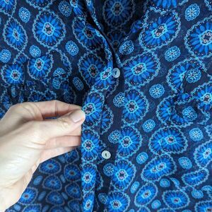 DESCRIPTION: sheer crepe Anita blouse in striking blue "Valencia Tile" pattern. Features hidden pearl buttons down the front, ruffled bell cuff, ruffled shoulders, and double breast pockets.