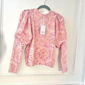 MISA Los Angeles Kali Cotton-Silk Puff-Shoulder Sweater in pink tie dye pattern. Knit sweatshirt with voluminous, gathered long sleeves and a fitted cuff. SIZE XS