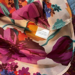 - Color/Pattern: Cream base with multicolor floral print (purple, orange, red)