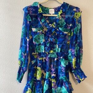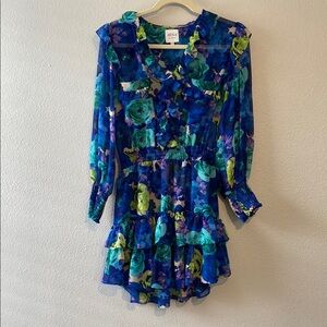 With a license to frill, this mini dress from Misa will have you feeling absolutely electric. Cut from gorgeous floral chiffon, this dress features an open v front, double chest pockets with ruffle detail and long sleeves with smocking at the wrist. The flattering silhouette is completed with an elasticated waistband leading into a tiered, lined mini-skirt.