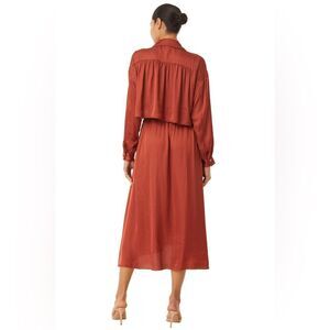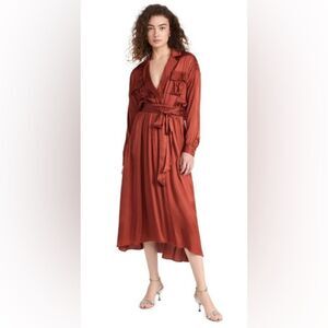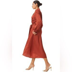 Fabric: Lightweight, non-stretch satin. Dropped shoulders and yoked back. Smocked elastic waistband. Optional, self-tie closure. Collared neck and notched collar. Long sleeves with button cuffs. On-seam side pockets. Shell: 55% viscose/45% rayon. Unlined. Dry clean. Made in the USA. Measurements: Measurements from size S Length: 50in / 127.0cm, from shoulder to front hem Length: 52.75in / 134.0cm, from shoulder to back hem