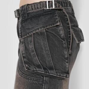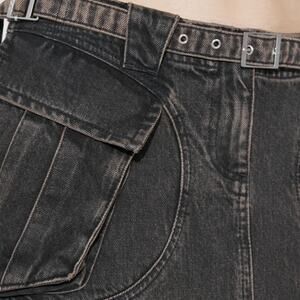 Cargo pockets, adjustable waist (see belt in photos), back slit. Slightly fitted through the hips.