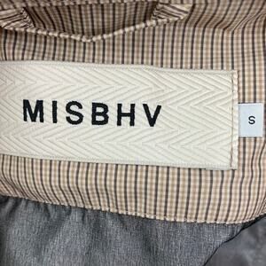 MISBHV 'Fisherman' vest comes in a beige checkered technical broadcloth polyester with a silver-tone lining featuring front pocket details, loose fit, transparent rubberized logo at front, sleeveless, y-neck collar, and a zip up closure.