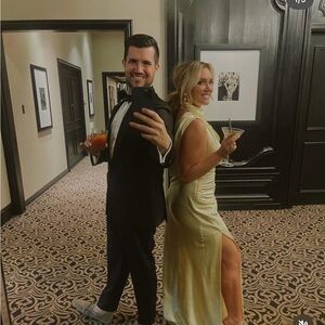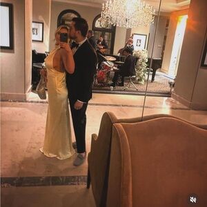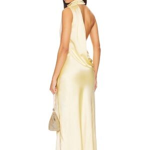 Gorgeous butter yellow/“soft yellow” satin Mischa gown dress. Draping open black is super flattering. Major Andie Anderson vibes! I wore this dress once to a wedding and got so many compliments.