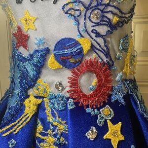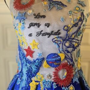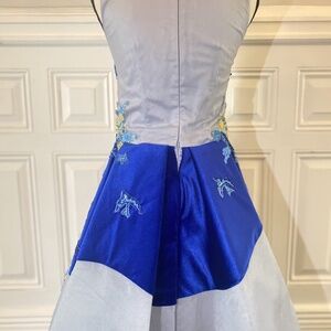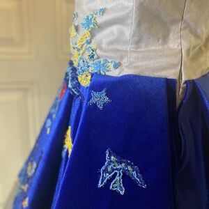 Mischka Aoki custom-made baby blue organza, with royal blue velvet details. Hand sewn with colorful beaded details and embroidered fairytale phrases. Goddess of the Sea collection.